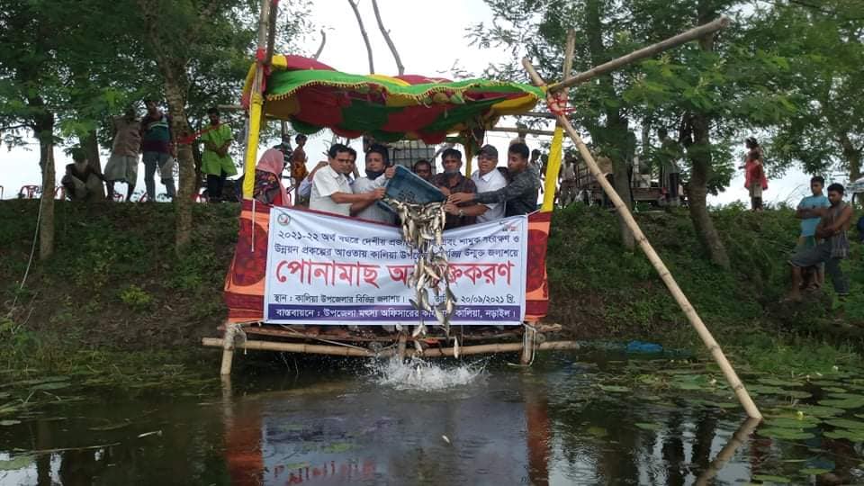 ২০/০৯/২০২১ খ্রি. তারিখে দেশীয় প্রজাতির মাছ এবং শামুক সংরক্ষন ও উন্নয়ন প্রকল্পের আওতায় ২০২১-২২ অর্থ বছরে কালিয়া উপজেলার বিভিন্ন জলাশয়ে রুই জাতীয় পোনামাছ অবমুক্ত করা হয়।